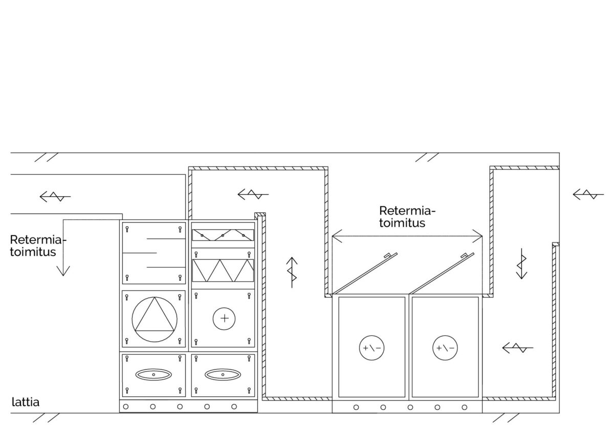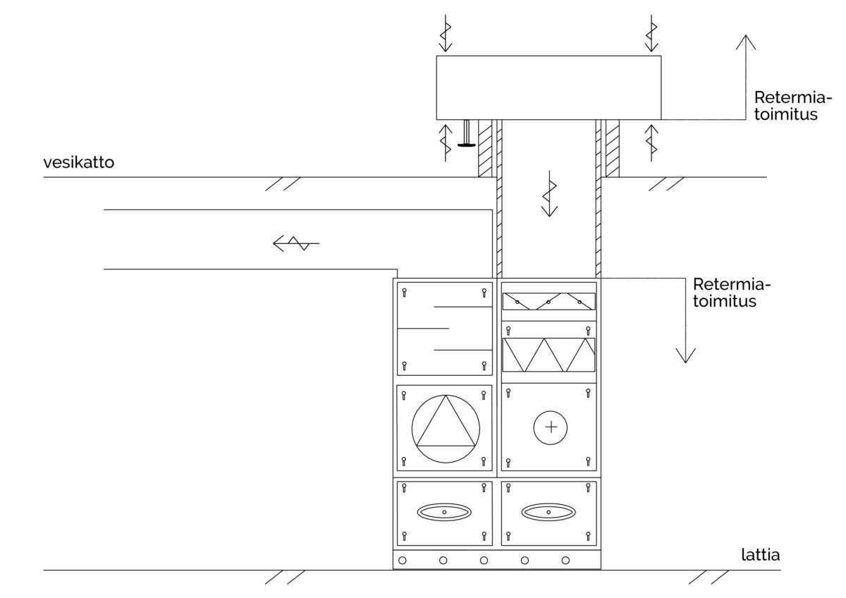 Suodatinta ennen sijaitsevat neulalämmönsiirtimet toimivat myös G3-tason esisuodattimina. Toisessa pystyosassa ovat puhallin- ja äänenvaimennustoiminnot. Konejalustalla varustetussa pohjaosassa on pesuvesiallas ja viemäröintiyhde. Pohjaosassa tuloilma siirtyy pystyosasta toiseen.