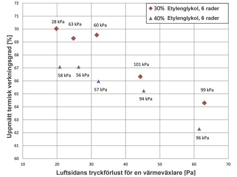 Uppmätta termiska verkningsgraden hos ett värmeåtervinningssystem med vissa typer av tvådelad nålvärmeväxlare som en funktion av tryckförlust för batteriets luftsida. Vätskesidans tryckförlust av nålvärmeväxlaren vid varje mätpunkt visas ovanför/under mätpunkten i fråga.