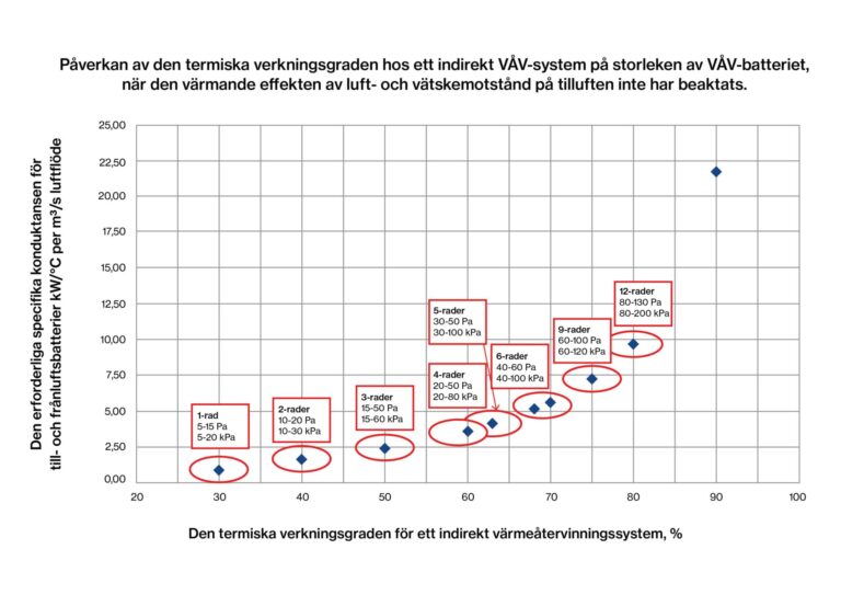 Det är nästan aldrig värt att dimensionera ett indirekt VÅV-system för ventilation till en termisk verkningsgrad över 70% (Retermia News 1/2016). Dessutom är frånluftsbatteriet mer benäget att frosta när termiska verkningsgraden maximeras. Det är vettigt att komplettera VÅV-system med intelligenta designlösningar, som inte bara använder frånluft utan även andra källor till gratis energi eller spillvärme, såsom returvatten från kylnätet, jord-, vatten- och solenergi, samt kondensationsvärme från kylutrustning för livsmedelskylning, till exempel. Intelligenta designlösningar, som passiv uppvärmning och kylning av tilluften, kan förbättra förmågan att minska effekttoppar och säkerställa att VÅV-systemet fungerar med full kapacitet även vid sträng köld.