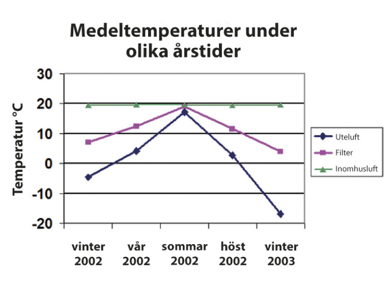 Den relativa luftfuktigheten i filtret hölls under 70% och temperaturen över 3°C under alla årstider. Filtret förblev torrt under hela sin livslängd, även vi kraftigt snöoväder. Detta minskade behovet för filterbyten. Mängden och arterna av mikrober som trivs i fuktiga förhållanden var mindre i filterkammare än i nålvärmeväxlaren, vilket visar att nålvärmeväxlaren förhindrar uteluftens mikrober att spridas till huvudfiltret.