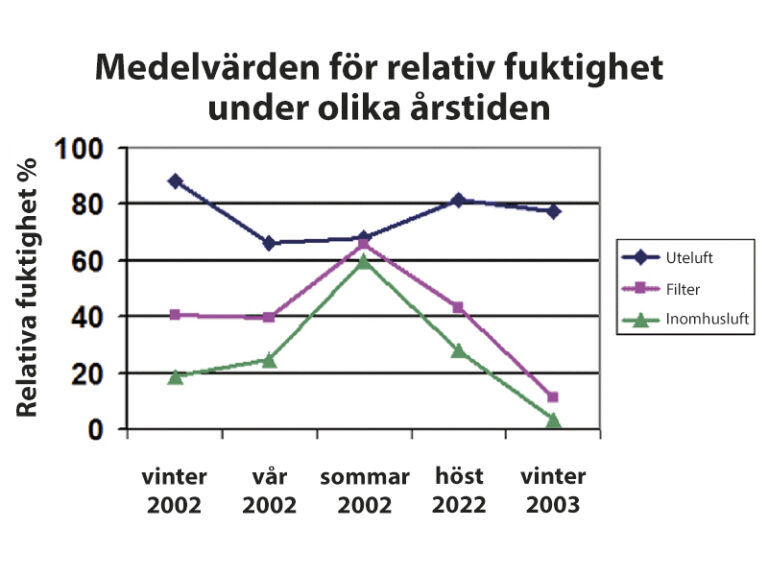Nålvärmeväxlaren höll den relativa luftfuktigheten i finfiltret under 70% under hela året [ritat efter tabell 1 i Halonen et al (2003)].